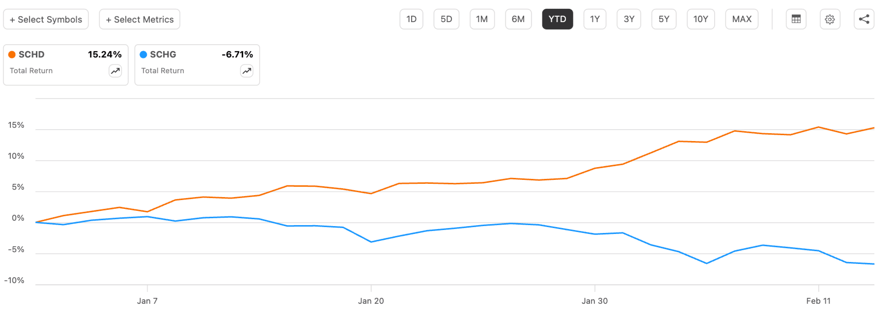 Here's your weekly helping of interesting investing information and insights. Opinion SCHD vs SCHG Have you seen what SCHD has done vs SCHG? It's up almost 25% since the calendar flipped to 2026! While SCHG is an ETF that bets on fast-growing tech companies and "the next big thing," SCHD is an ETF that focuses on steady, "old-school" companies that pay out cash to their shareholders every year.This massive flip is happening because investors are getting scared that AI will ruin many software...